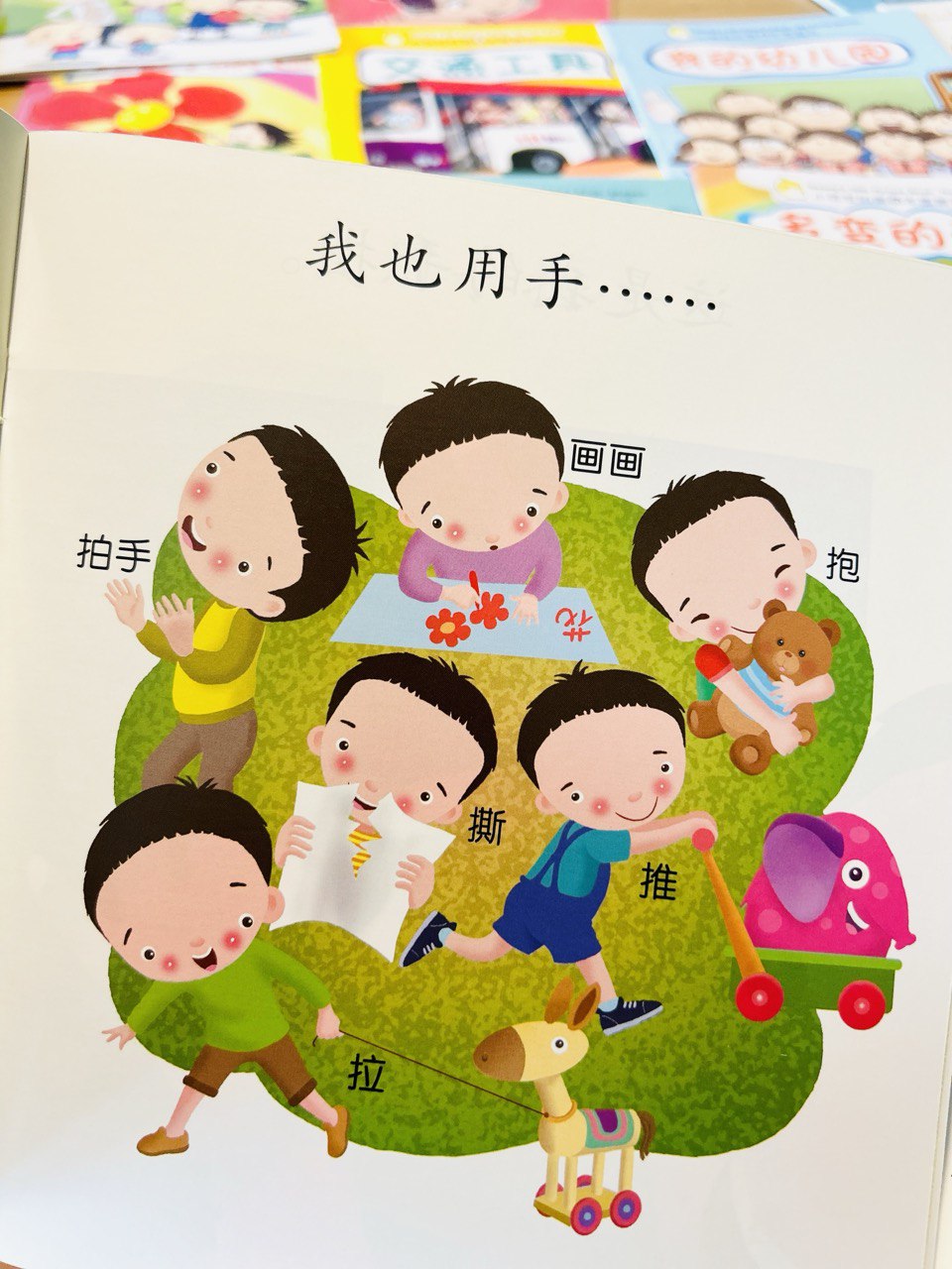 I like the book 我的身体 My Body as it introduces action words that we encounter in our daily lives, like 走、跑、跳 、蹲、滚、拍球、画画 that we can immediately use in our daily conversations.