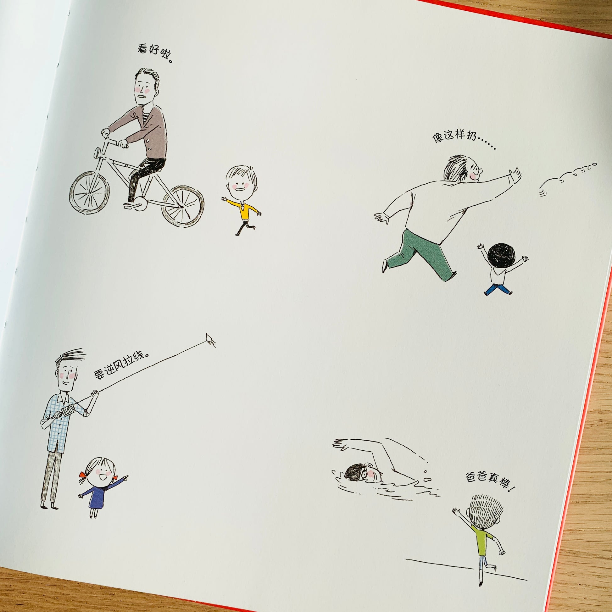 In the book about fathers, there’s a running narrative of 4 fathers teaching their children different things like cycling, skipping stones, flying a kite and swimming. It was heartwarming because these are the things we do with our kids now.