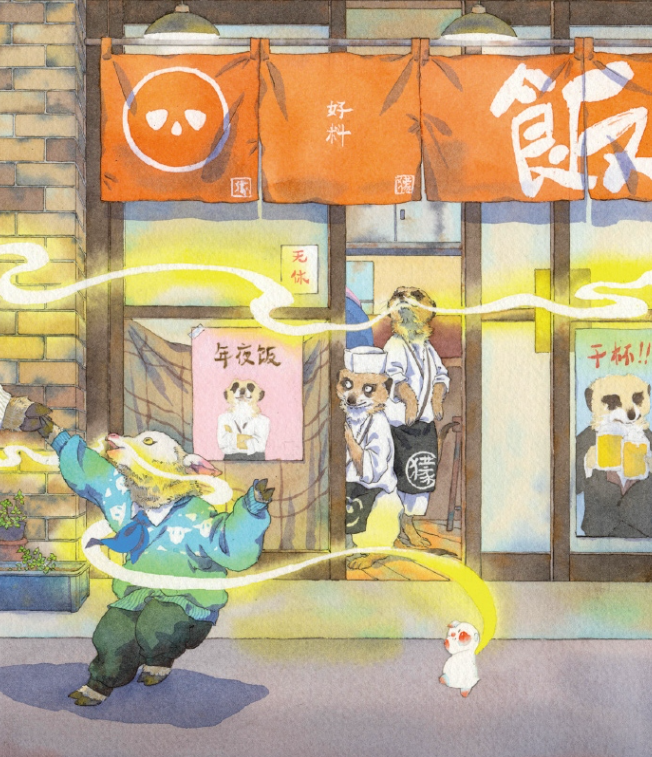 小福气 came upon Little Fox who offered him a bowl of really yummy noodle soup and warmed his heart. It wondered why there were no crowds at their shop even if it was so tasty, and Little Fox explained that others didn't trust their shop because it was run by foxes.