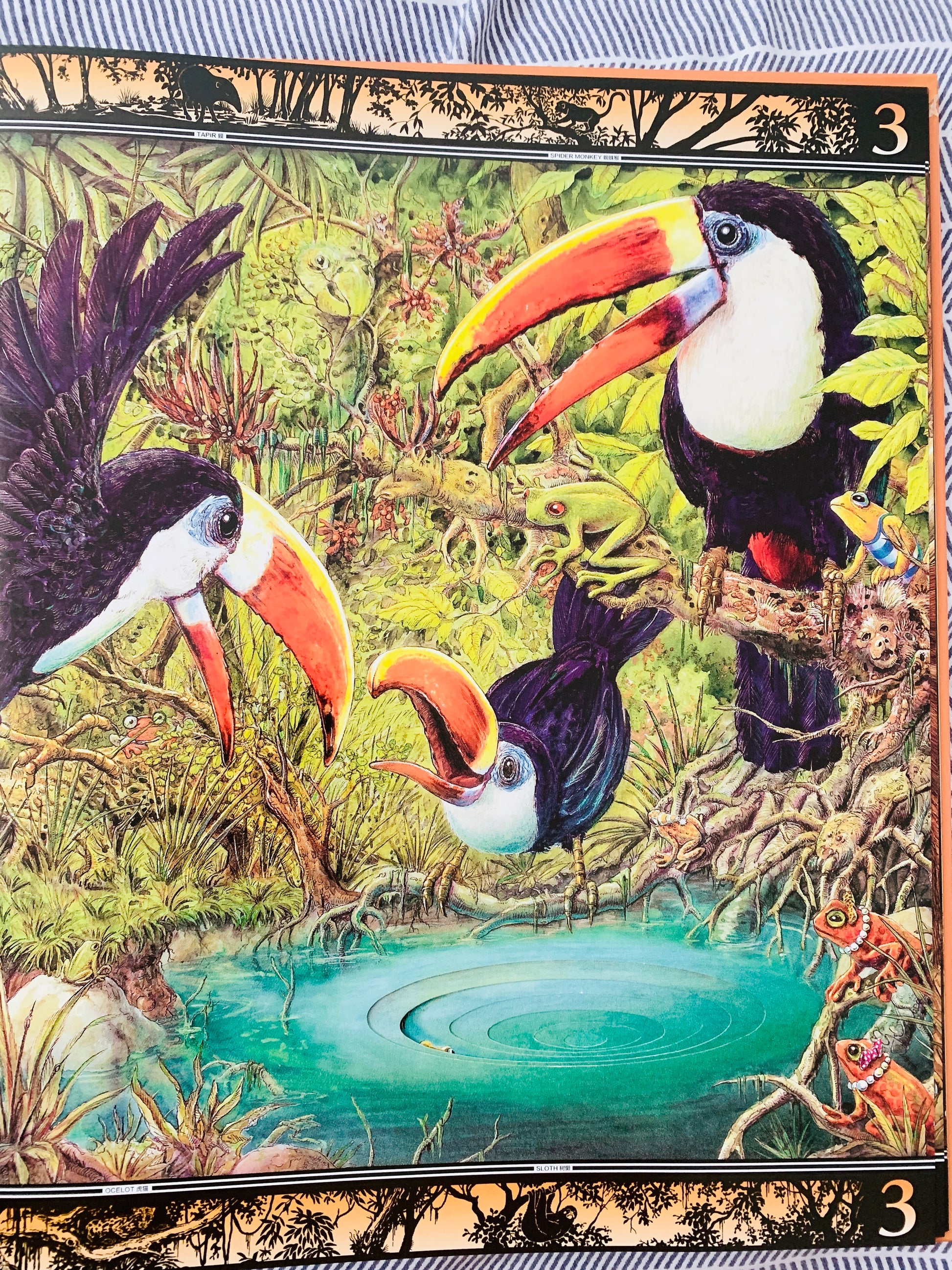 This is a really interesting combination of a counting book, art book, geography book and storybook. It showcases animals across different continents and habitats, gathering among waterholes in their common need for hydration for survival.