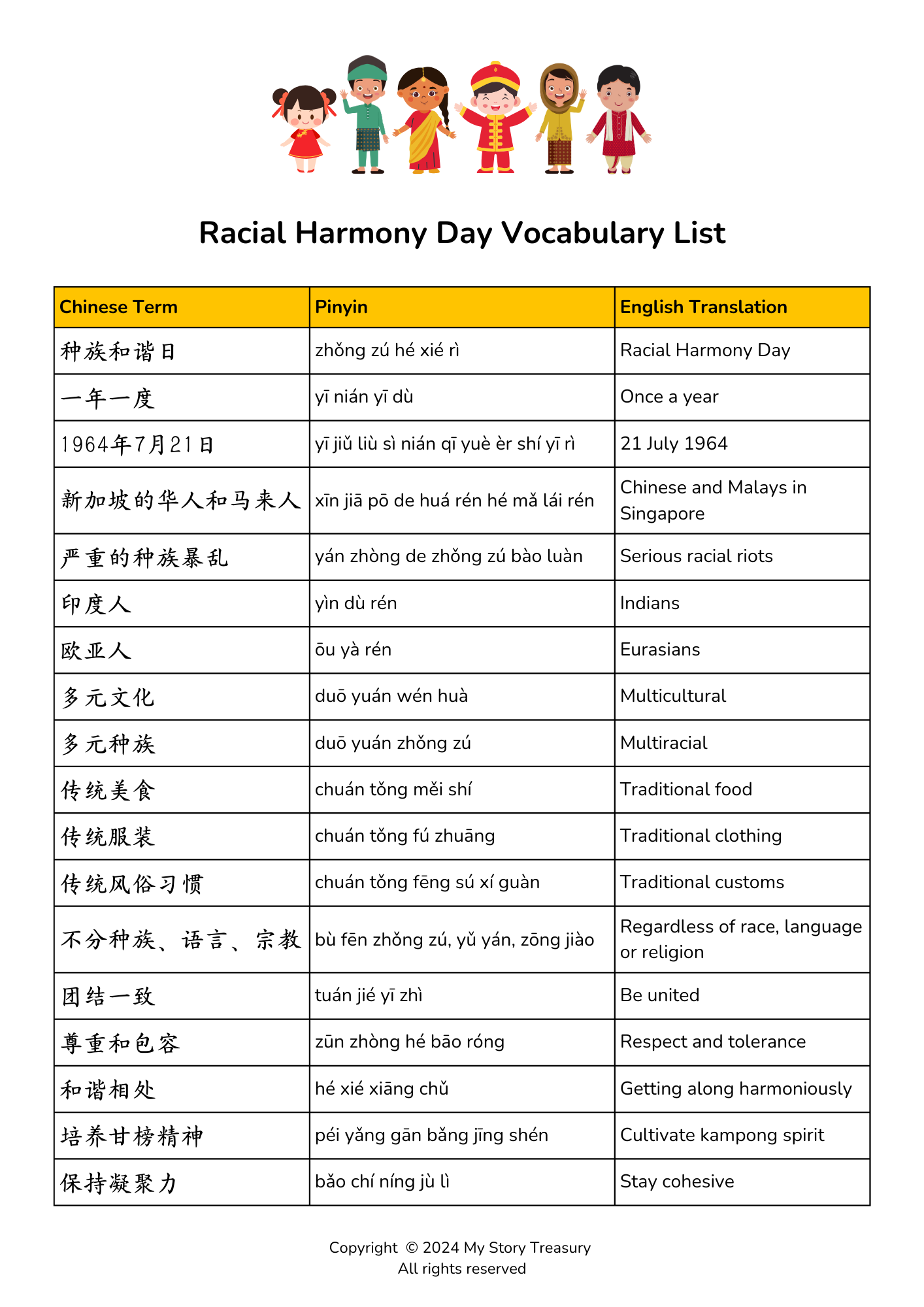 Racial Harmony Day is celebrated annually in Singapore on July 21 to commemorate the 1964 race riots as well as celebrate multiculturalism, racial harmony and diversity.